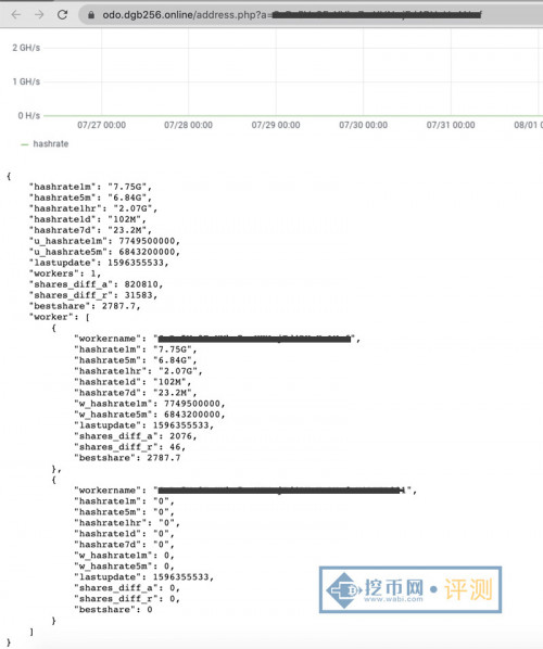 点击show status 按钮进入查询页面,上面显示算力图表,下面json 格式显示具体算力信息, dgb256这也太不友好了,太懒了也不显示一个表格。