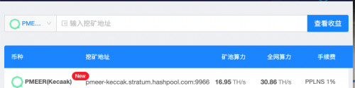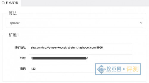 2. 配置矿池信息,qitmeer , 我们使用当前算力最高的矿池https://hashpool.com/矿池来测试, 如下图配置, 挖矿地址 pmeer-keccak.stratum.hashpool.com:9966 钱包地址使用qitmeer地址。▼