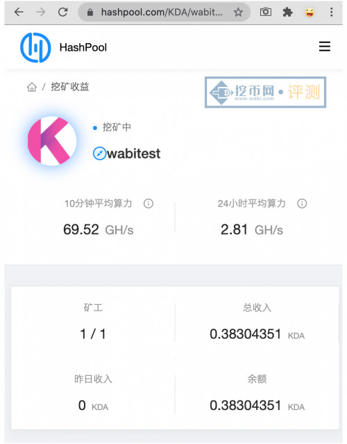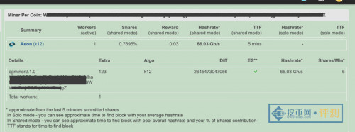 在zergpool 网站输入钱包地址,查看矿机算力信息,矿池显示算力为66.03Gh/s。