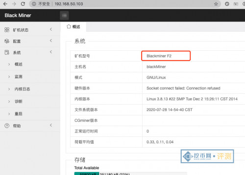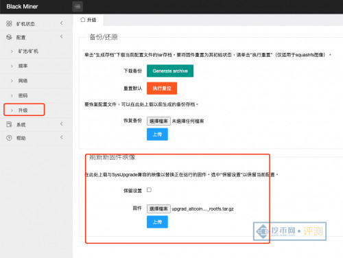 到后台菜单 ,选择 配置-》升级 进入升级页面,在刷新固件映像里面先刷新rootfs文件 保留设置勾掉, 刷好后在回到首页,查看矿机型号显示为Blackminer F2▼