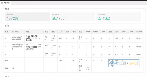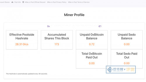 再看看矿池端算力信息, 在矿池 http://mike.rs/account/ 页面输入矿工地址来查看,我们可以看到矿池端显示为28.31Gh/s 。▼