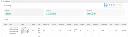 查看矿机运行状态,显示平均算力为29.0584Gh/s。▼