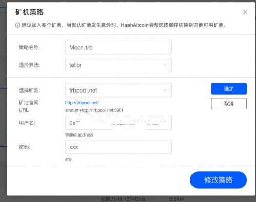 我们选择tellor算法,选择好后添加矿池,这里我们选择trbpool.net 用户名填写ETH地址,密码随意。▼
