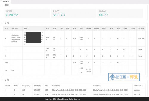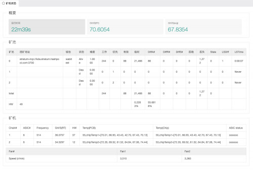 查看矿机运行状态 显示矿机平均算力为65.92Gh/s。▼