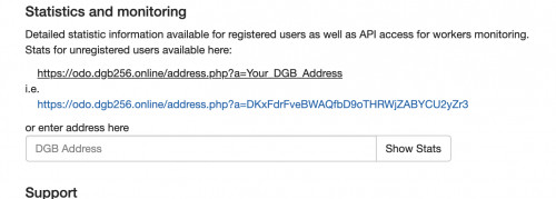 看一下矿池端显示的算力信息, 打开https://odo.dgb256.online/ 在统计和监控处出入dgb挖矿地址查询