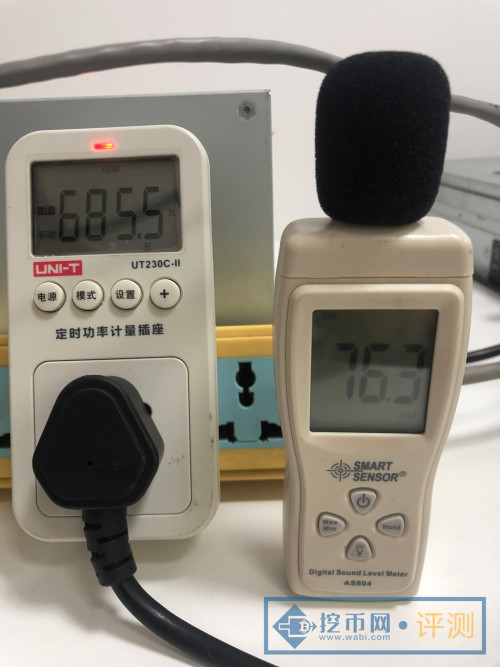 在室温26.7度时测得矿机功耗为685.5W, 噪音为76.3分贝。▼