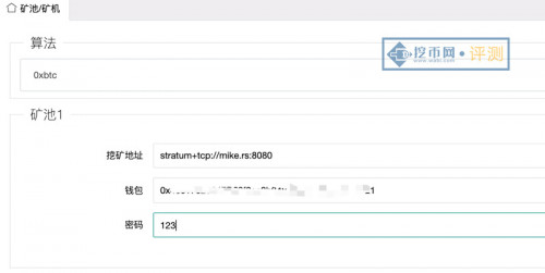 2. 配置矿池信息,0xtoken 算法可以挖0xbtc, 我们使用http://mike.rs/矿池来测试, 如下图配置, 挖矿地址 stratum+tcp://mike.rs:8080 钱包地址使用ETH地址,因为0xbtc是ERC20代币。▼