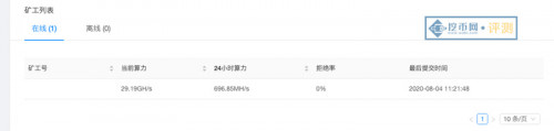 看一下矿池的算力情况, 矿池端显示算力为10.79GH/s 算力也是符合官方算力的。▼